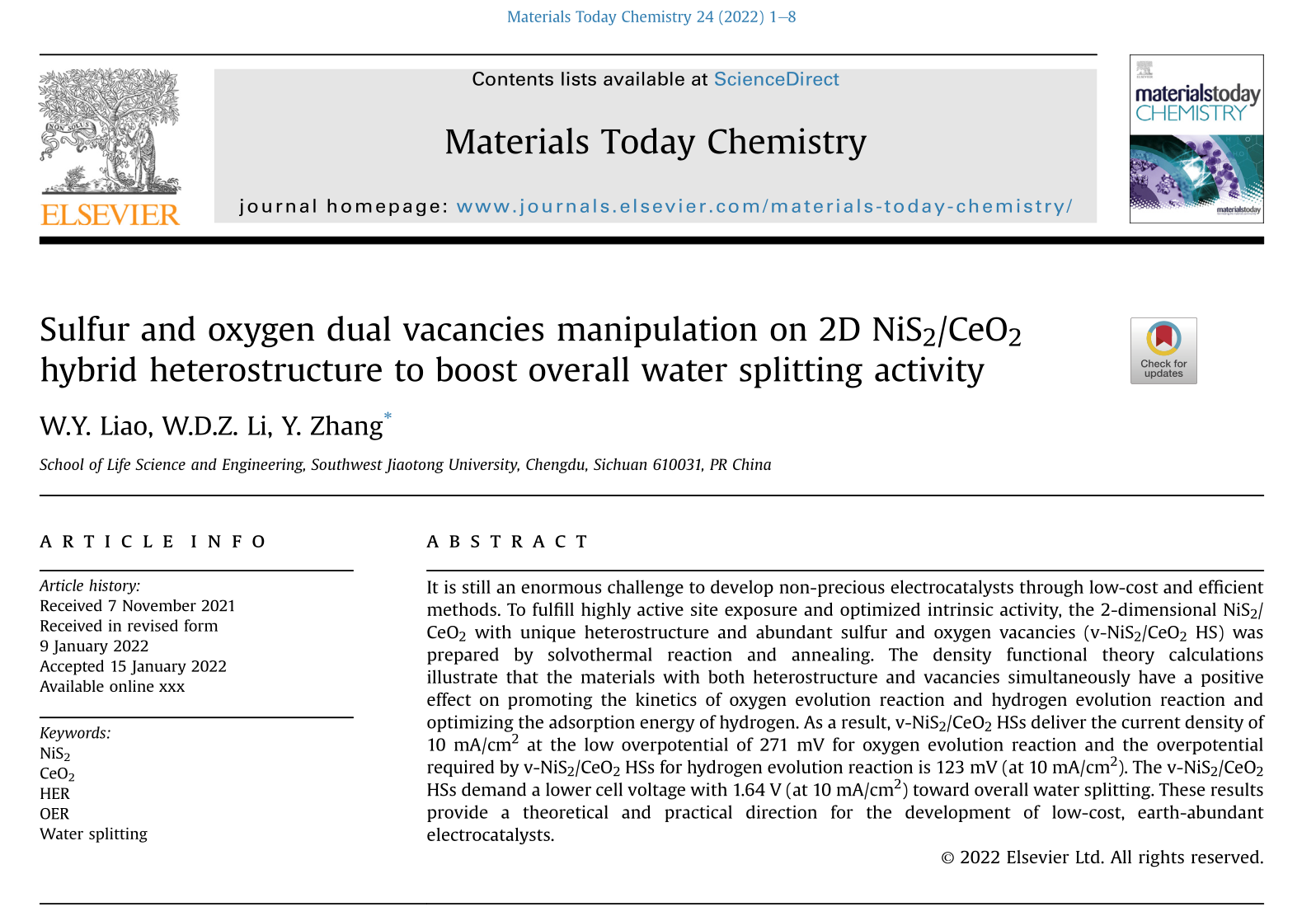 麻豆社 张颜老师在化学领域TOP期刊Materials Today Chemistry发表最新研究成果